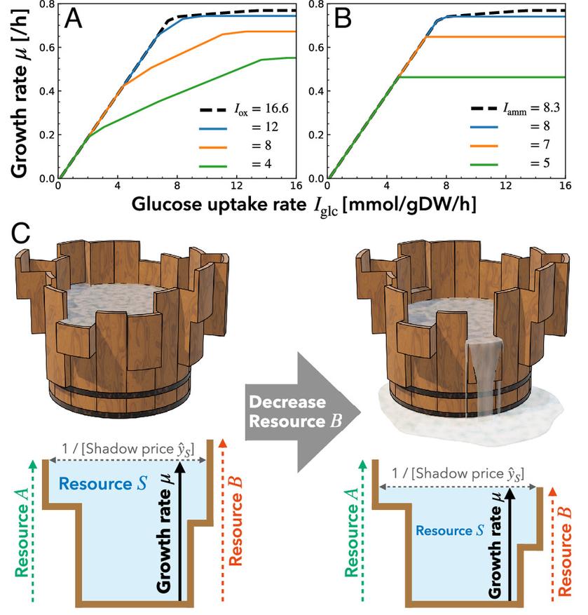 Самое сильное в этой работе — как она объединяет две классические идеи. Первая — это уже упомянутый закон Моно. Вторая — закон минимума Либиха, сформулированный еще в XIX веке для сельского хозяйства. Он гласит, что рост растения определяет тот элемент, которого меньше всего. Эту идею часто иллюстрируют образом бочки с досками разной высоты: воду можно налить лишь до уровня самой короткой доски.