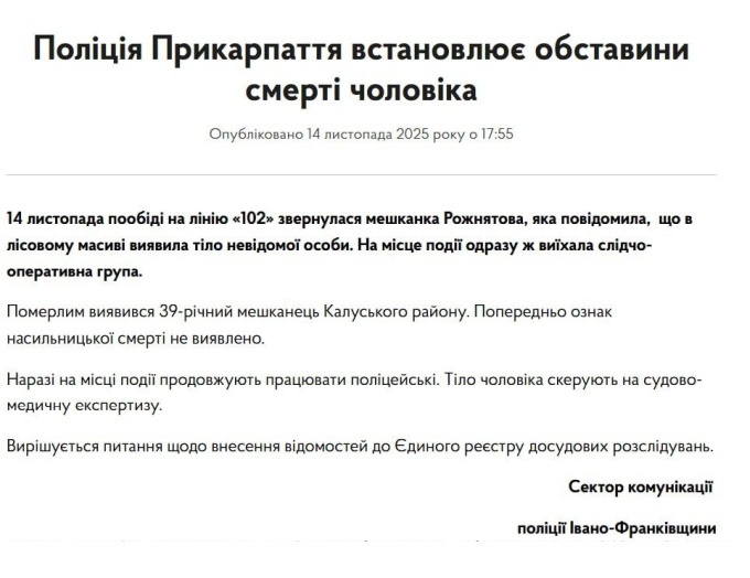 «8 ноября 2025 года мужчина 1986 года рождения был призван по мобилизации в Калушский РТЦК и СП (г. Долина). По результатам военно-врачебной комиссии он был признан годным к службе в воинских частях обеспечения, ТЦК и СП, ВВУЗ, учебных центрах, заведениях (учреждениях), медицинских подразделениях, подразделениях логистики, связи, оперативного обеспечения, охраны. Таким образом, мужчина был распределен на военную службу в роту охраны 1 отдела Калушского РТЦК и СП. 12 ноября, во время службы, 39-летний военнослужащий совершил самовольное оставление части. В тот же день данные об этом случае были переданы в ВСП, после чего начались розыскные действия. А уже 14 ноября 2025 года правоохранители сообщили, что в лесу в Рожнятовском районе найдено тело мужчины», — заявили в военкомате.