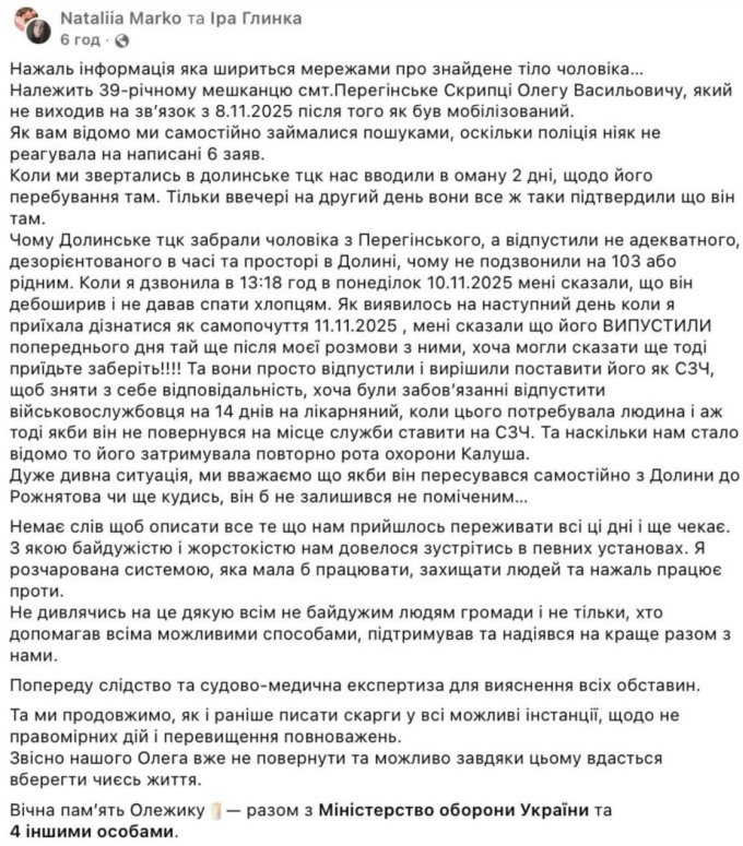 «Они просто отпустили и решили поставить его как СОЧ, чтобы снять с себя ответственность... Насколько нам стало известно, его повторно задерживала рота охраны Калуша», — написала знакомая погибшего.