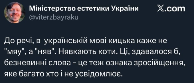 «Кстати, в украинском языке киска говорит не «мяу», а «няв». «Нявкают» коты. Эти, казалось бы, невинные слова - это тоже признак русификации, которую многие и не осознают», - гласит некое «министерство эстетики Украины».