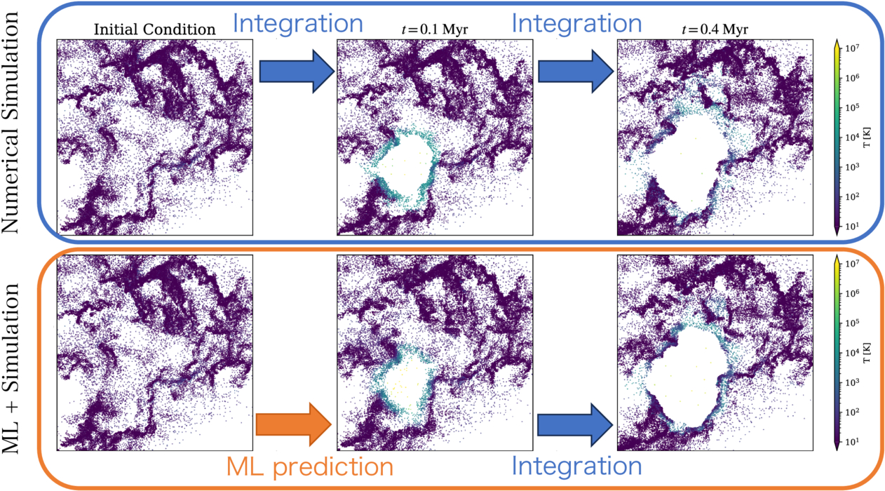 - Основные узлы. Огромное число процессоров (в экспериментах на суперкомпьютере Fugaku их было почти 150 тысяч), которая занимается симуляцией гравитации и движения газа в масштабах всей галактики. Они работают с большим, эффективным шагом по времени — например, 2000 лет.