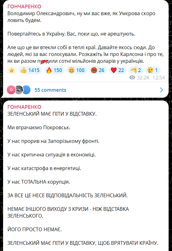 Через 10 минут после этой публикации Гончаренко написал, что Зеленский «должен уйти в отставку», и перечисли основания для этого требования.