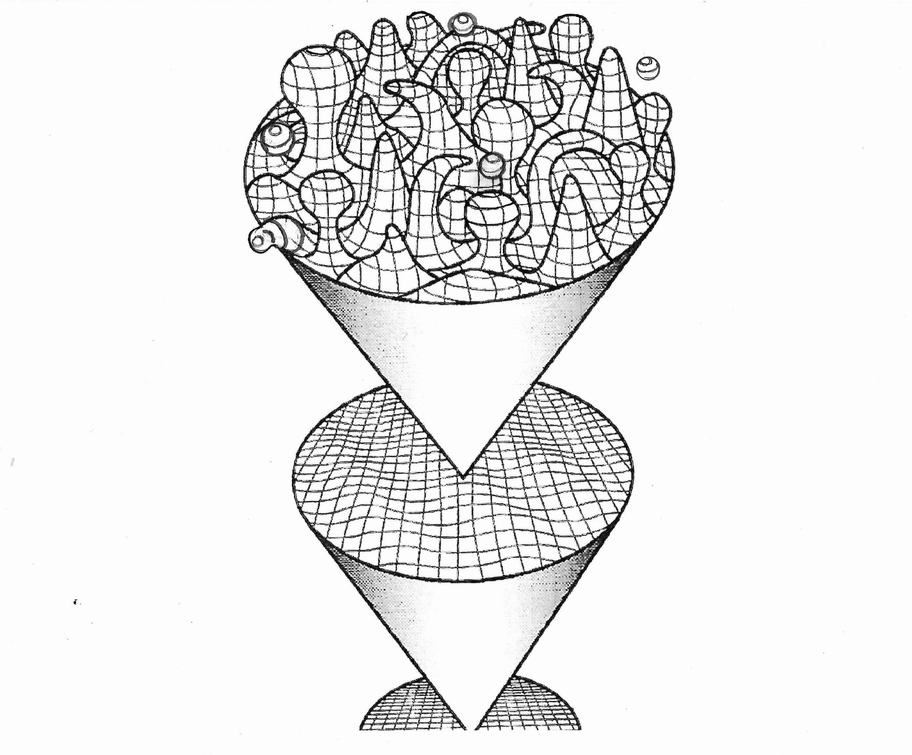 На привычных нам масштабах пространство-время воображается гладким и непрерывным. Но теория предсказывает, что если увеличить его до предельных, планковских масштабов, картина кардинально изменится. Там пространство перестает быть статичным. Оно превращается в квантовую пену — бурлящий, хаотичный океан энергии, в котором постоянно рождаются и умирают виртуальные частицы, а сама геометрия пространства-времени колеблется.