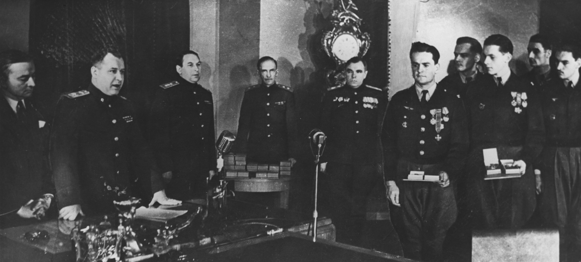 - Маршал авиации Александр Новиков (второй слева) выступает с речью. Вручение орденов СССР офицерскому составу воинской части Сражающейся Франции - "Нормандия"