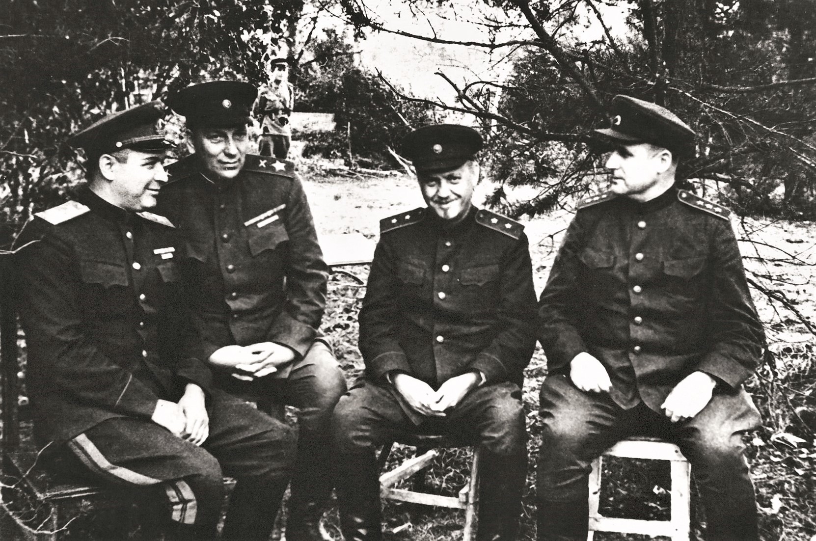 - Слева направо: представители Ставки ВГК маршал авиации А. А. Новиков и маршал артиллерии Н. Н. Воронов, член Военного совета фронта генерал-лейтенант Н. А. Булганин и командующий Западным фронтом генерал-полковник В. Д. Соколовский