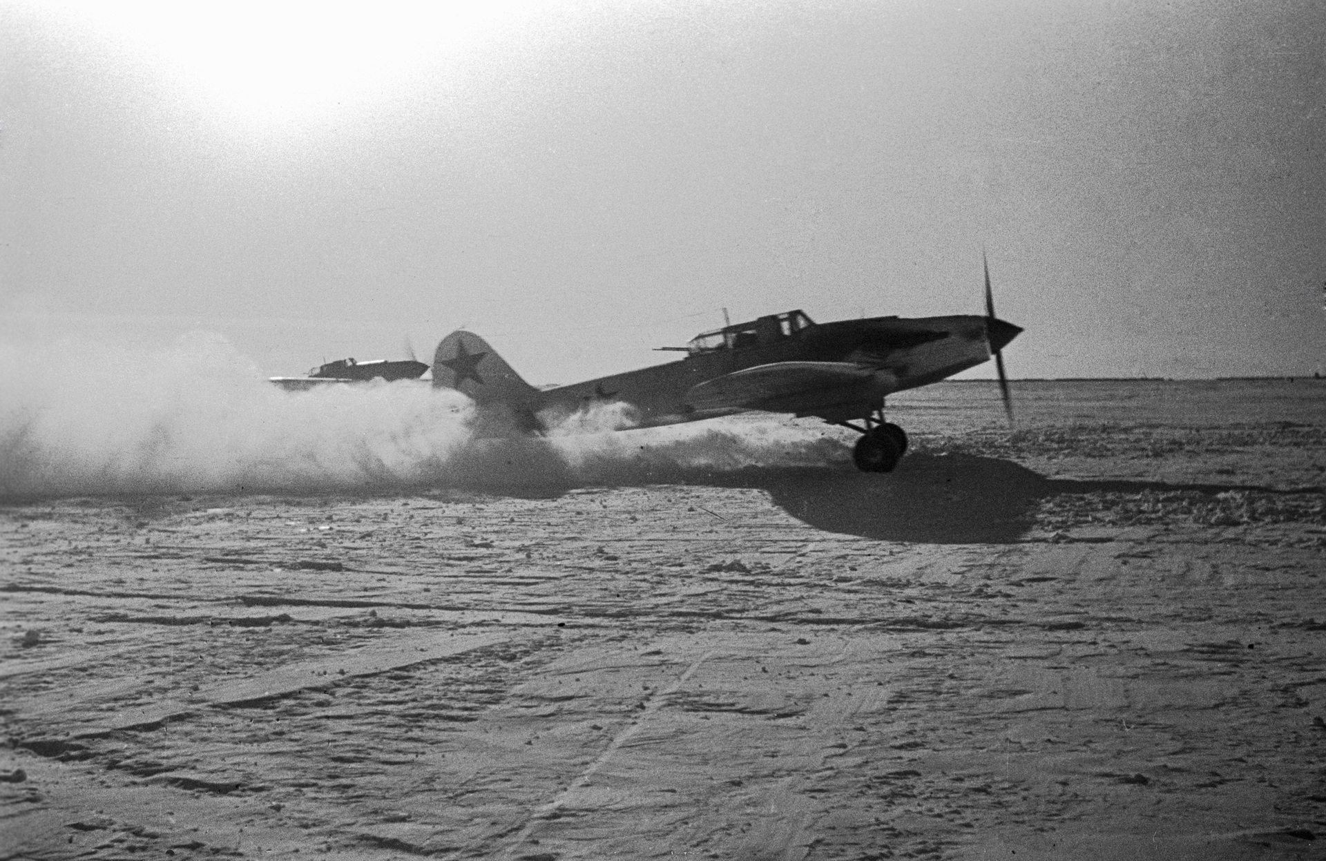 - Великая Отечественная война 1941-1945 гг. Сталинградская битва (17 июля 1942 года – 2 февраля 1943 года). Советские штурмовики Ил-2 взлетают с полевого аэродрома под Сталинградом