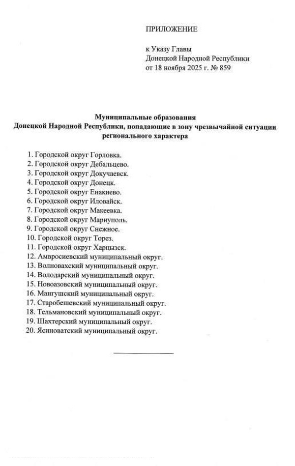Согласно указу Пушилина, режим «чрезвычайная ситуация» введен для органов управления и сил территориальной подсистемы республики, единой государственной системы предупреждения и ликвидации чрезвычайных ситуаций (РСЧС), а также для органов управления и сил муниципальных образований, определенных в приложении к указу.