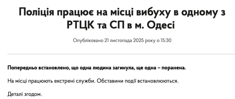 Сегодня, 21 ноября, днём в здании Суворовского ТЦК прогремел взрыв. Один человек погиб, второй ранен. Об этом сообщает местная полиция.