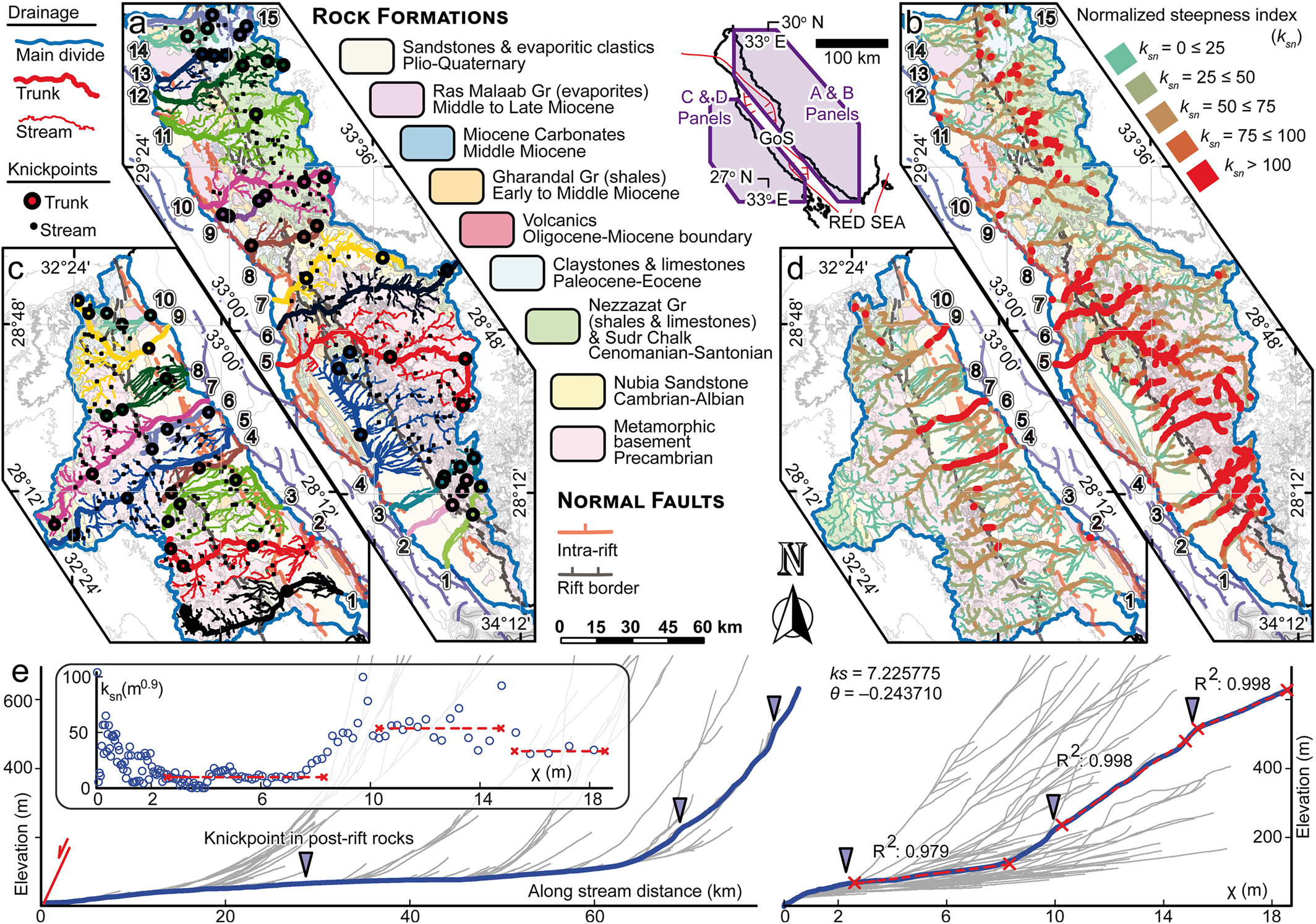2. Профиль рек и индекс крутизны: река всегда стремится выровнять свое русло. Если тектонические силы поднимают участок суши, река реагирует изменением наклона. Исследователи проанализировали сотни речных профилей, используя индекс нормализованной крутизны. Они обнаружили «никпойнты» — резкие перегибы в профиле русла, похожие на пороги или водопады. Эти перегибы не связаны с твердостью пород. Они четко коррелируют с линиями разломов, которые прорезают даже молодые отложения плиоцен-четвертичного возраста. Это прямое доказательство того, что разломы активны и продолжают подбрасывать русла рек вверх.