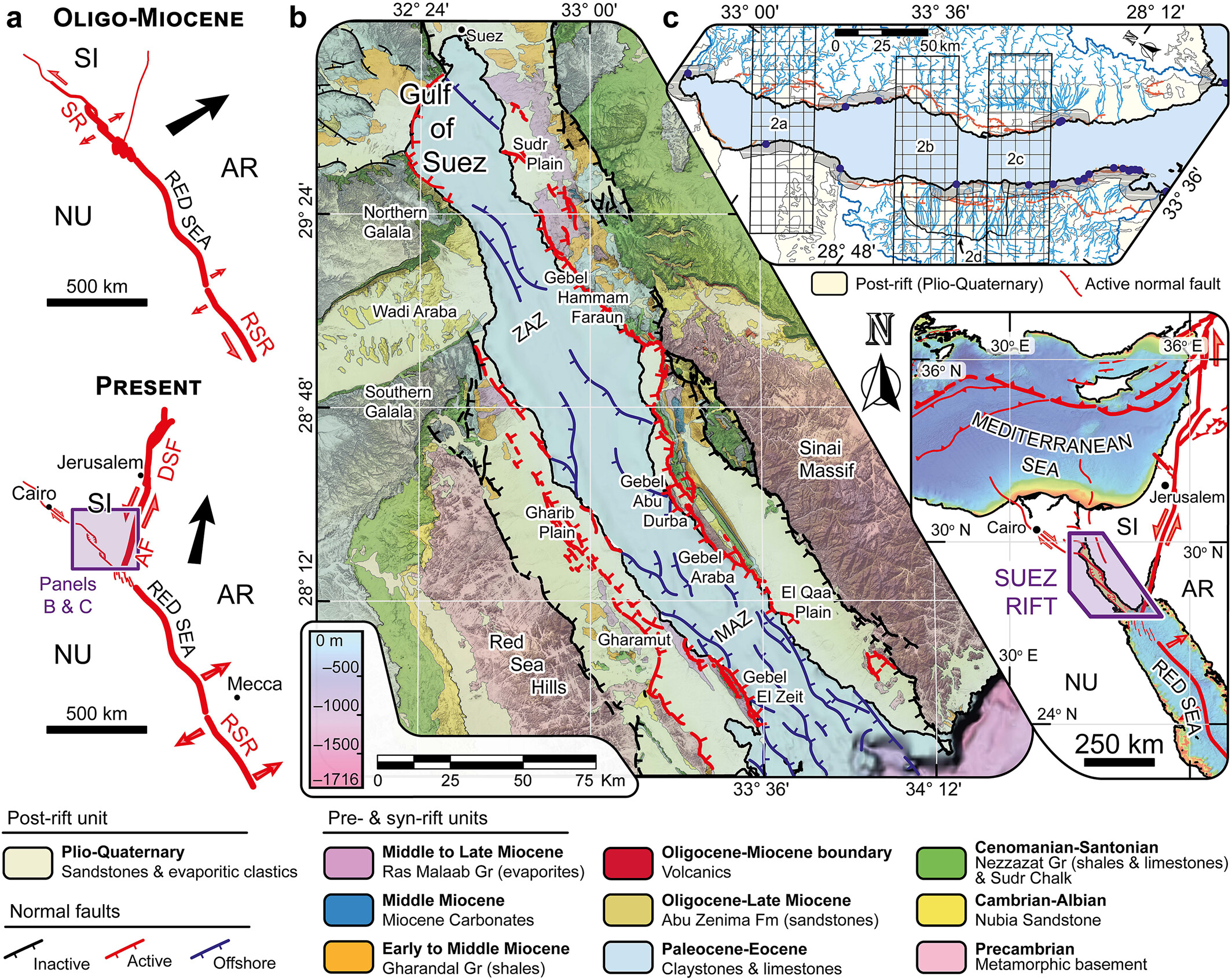 Традиционная модель эволюции Суэцкого рифта выглядит так: активная фаза шла в олигоцене и миоцене, затем произошла реорганизация плит, и активность сместилась в залив Акаба. Суэцкому заливу осталась лишь фаза термального проседания — пассивного опускания дна по мере остывания литосферы.