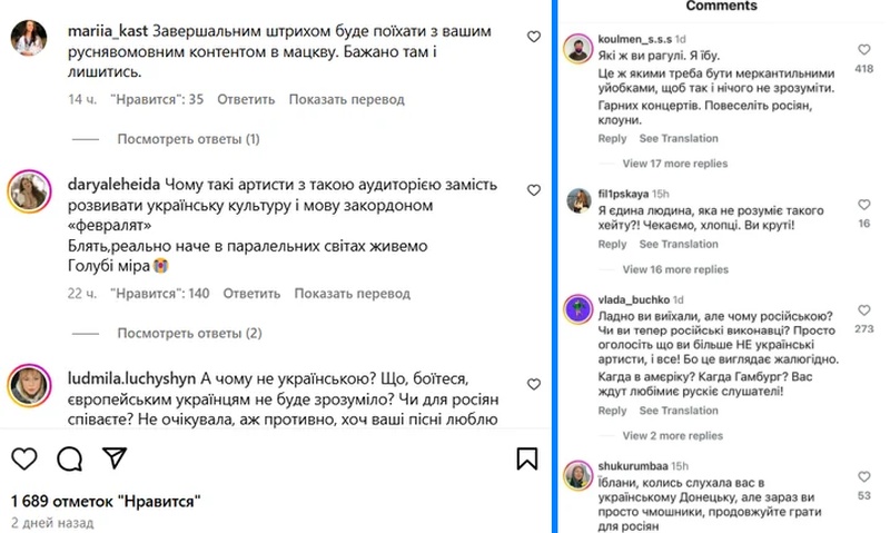 «Завершающим штрихом будет поехать с вашим русскоязычным контентом в Москву. Желательно там и остаться… Когда-то очень сильно вас любила. Но сейчас вы просто жалкие. Жаль видеть, как когда-то кумиры превращаются в де***мо», — возмущались подписчики группы.