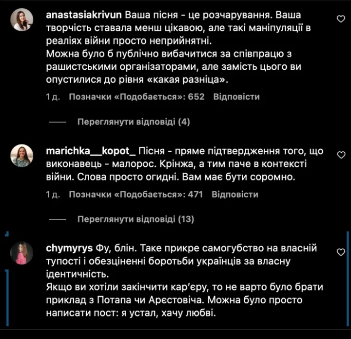«"Ваша песня — это разочарование. Ваше творчество становилось менее интересным, но такие манипуляции в реалиях войны просто неприемлемы. Можно было бы публично извиниться за сотрудничество с российскими организаторами, но вместо этого вы опустились до уровня "какая разница"",