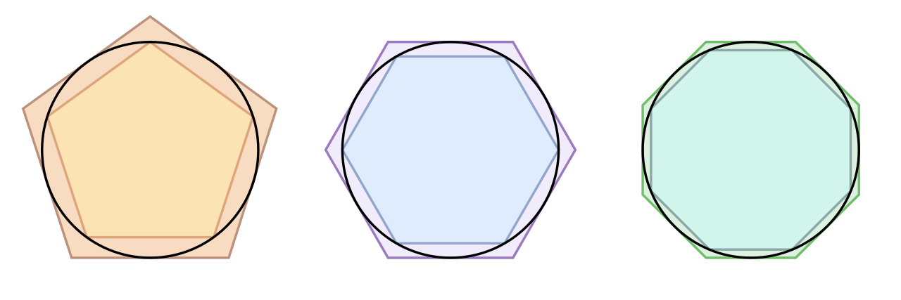 Интересно, что настолько важная постоянная величина как π, насчитывает тысячи лет. Первые попытки вычислить отношение окружности к диаметру предпринимались ещё в Древнем Египте и Вавилоне. Египтяне использовали приближённое значение 3,16, а вавилоняне — 3,125. Более точные расчёты провёл Архимед в III веке до н. э. Он вписал и описал многоугольники вокруг окружности, и получил значение π между 3,1408 и 3,1429. Это тот метод, что изображён на фоне выше, в качестве графического объяснения. В Китае математик Лю Хуэй довёл точность до 3,14159, используя многоугольник с 3072 сторонами. Позднее индийские и арабские учёные продолжили работу, а в