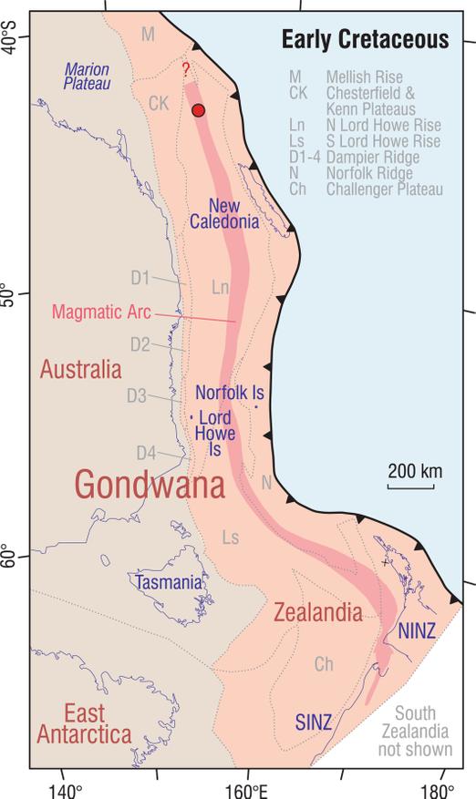 В юрском и меловом периодах (от 200 до 100 млн лет назад), когда Зеландия была частью суперконтинента Гондвана, вдоль её края проходила зона субдукции. Океаническая плита погружалась под континентальную, вызывая плавление мантии и образование цепочки вулканов и магматических камер. Это называется магматической дугой.