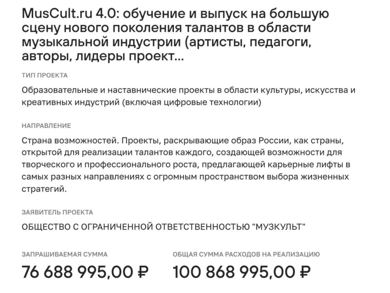 «76 миллионов на год. Таланты искать. Кто-то любит вкусно кушать. И контору под грант создали: ООО «Музкульт» зарегистрировано в декабре 2024 года в Москве. Директором является Влада Геннадьевна Муравьёва, которая также владеет 50% долей в компании вместе с Ангелиной Анатольевной Долиной», — отметил он в своём телеграм-канале «Zergulio».