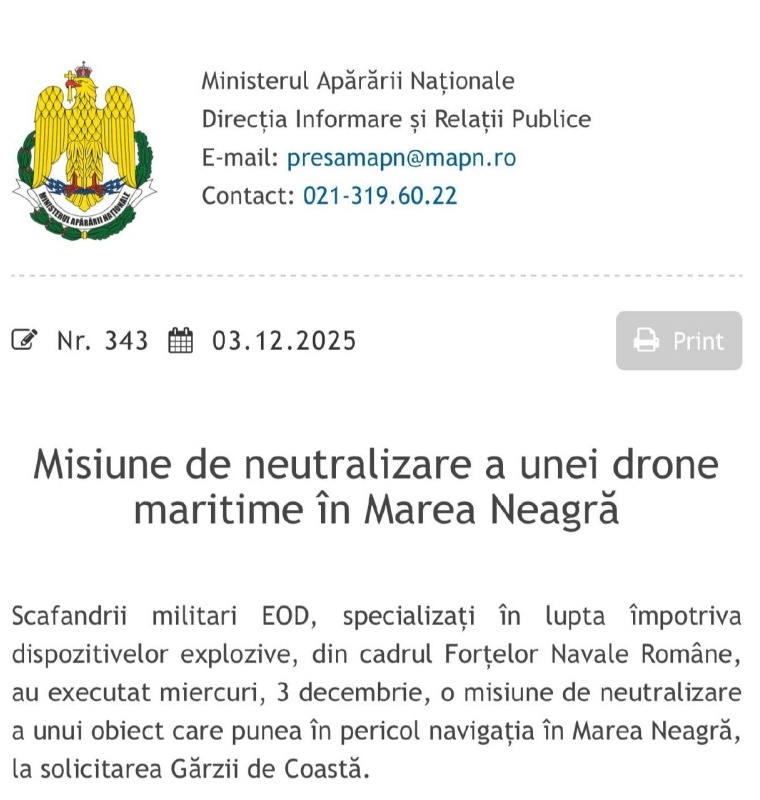 3 декабря 2025 года румынские ВМС в 67 км от Констанцы обнаружили и нейтрализовали контролируемым подрывом украинский морской дрон Sea Baby. Как подчеркнули в Минобороны Румынии, аппарат представлял угрозу судоходству.