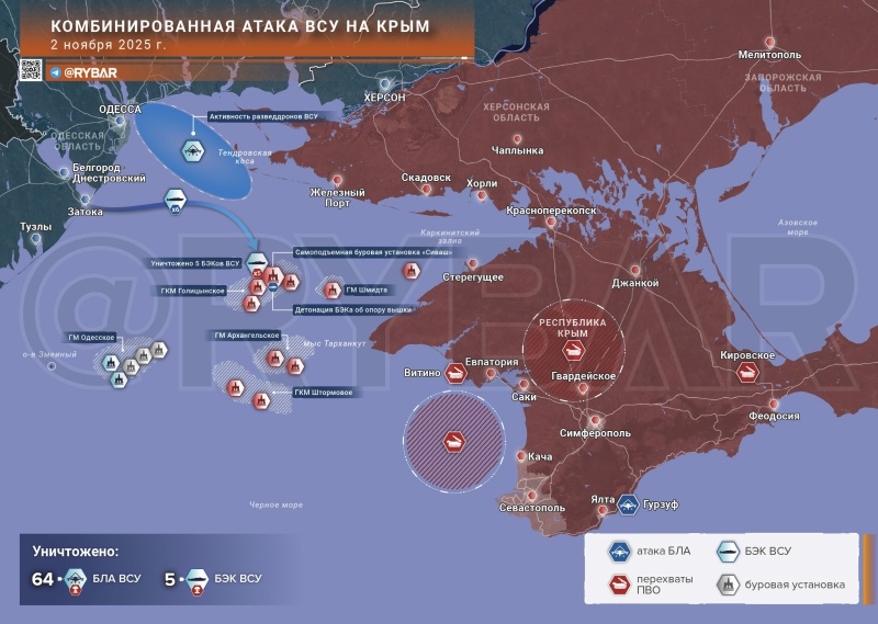 В Черном море украинская сторона вновь осуществила попытку удара безэкипажными катерами. В ночь на 2 ноября целями одинбезэкипажных катеров стали газодобывающие вышки на Голицынском месторождении.