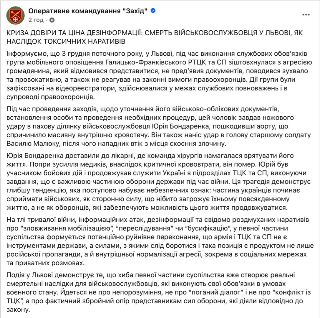 «Событие во Львове демонстрирует, что ошибочные убеждения определенной части общества уже создают реальные смертельные последствия для военнослужащих, которые выполняют свои обязанности в условиях военного положения. Речь идет не о недоразумении, не о «плохом диалоге» и не о «конфликте с ТЦК», а о фактическом вооруженном сопротивлении представителям сил обороны, действовавших в соответствии с законом», - заявили в ОК.