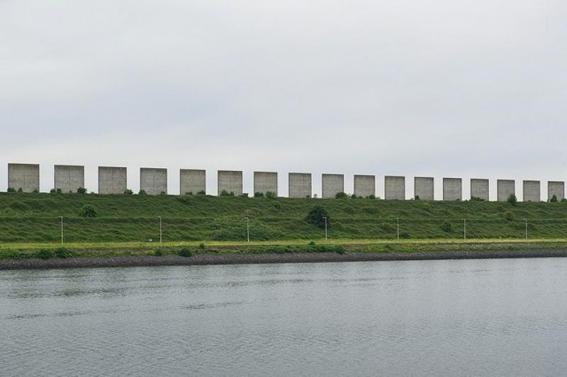 Около моста ширина стен достигает всего 4 метров. На севере стены полукруглые плиты сменяются кубическими плитами размером в 10 метров, которые расположены на насыпи высотой в 15 метров, что в целом позволяет достичь тех же 25 метров, как и в других секциях. Барьер сохраняет эту форму до самого конца, где среди деревьев расположено газохранилище.
