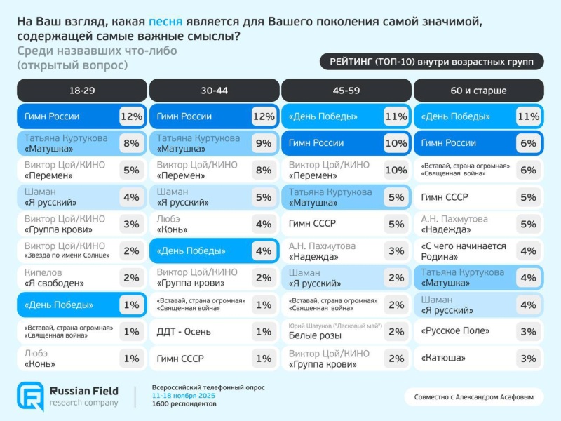 Социологическая группа Russian Field совместно с российским политологом Александром Асафовым провели исследование так называемого культурного кода России в части песен, а именно: какие из них люди считают действительно важными для своего поколения. В опросе приняли участие 1600 респондентов разного пола, возраста и мест проживания.