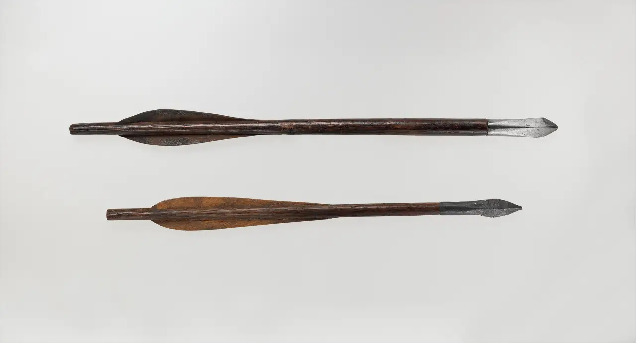 Две стрелы для арбалета («болты»), XV или XVI в. Длина 43,7 см; длина наконечника 6,6 см. Вес 74 г. Метрополитен-музей, Нью-Йорк