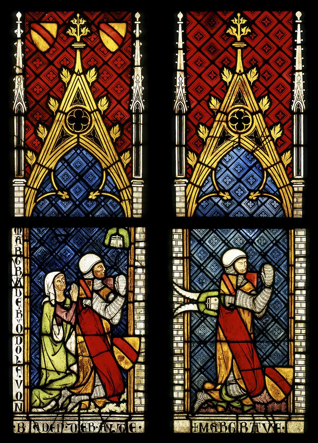Два маркграфа из Бадена в шлемах-подшлемниках (ранний типа бацинета) на голове. Большой шлем, сильно ограничивающий обзор и дыхание, обычно надевали поверх этой «металлической шапочки». Здесь же изображены два шлема топфхельм с нашлемными украшениями. Витраж из церкви цистерцианского монастыря в Лихтентале, около 1300/1310 гг., Баденский государственный музей, Карлсруэ