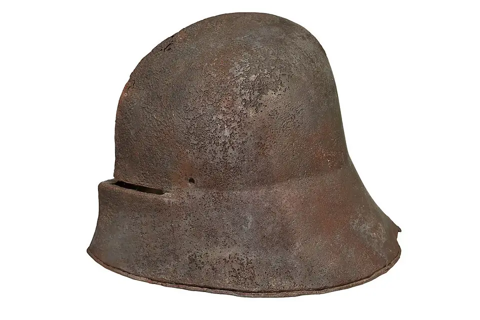 Шлем салад (саллет) очень ржавый и старый. Музей национальной истории Трансильвании, город Клуж-Напока, Румыния