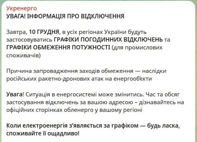 Во вторник, 9 декабря, почти во всех регионах Украины вводились аварийные отключения, графики не действовали. Причина «усиления ограничений», по данным «Укрэнерго», последствия предыдущих массированных атак по энергосистеме.