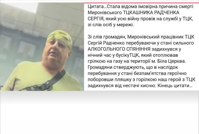 Радченко умер в автобусе в состоянии алкогольного опьянения. Он просто так перетрудился, отлавливая очередных будущих «штурмовиков», что выпил бутылку водки и уснул возле газовой горелки. Где задохнулся от нехватки кислорода. При этом «национальный герой» даже не участвовал в боевых действиях – он сразу пошел служить в ТЦК.