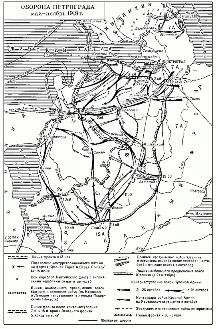 Вернемся в тревожный 1919 год. Для отражения наступления Юденича к Петрограду в кратчайшие сроки были переброшены новые боевые части Красной армии, среди них были даже некоторые соединения 2-й дивизии из сражавшейся против Колчака армии Фрунзе.