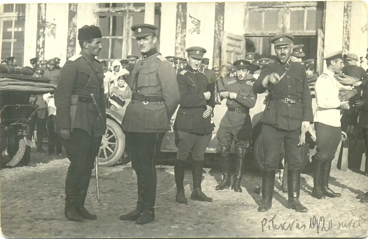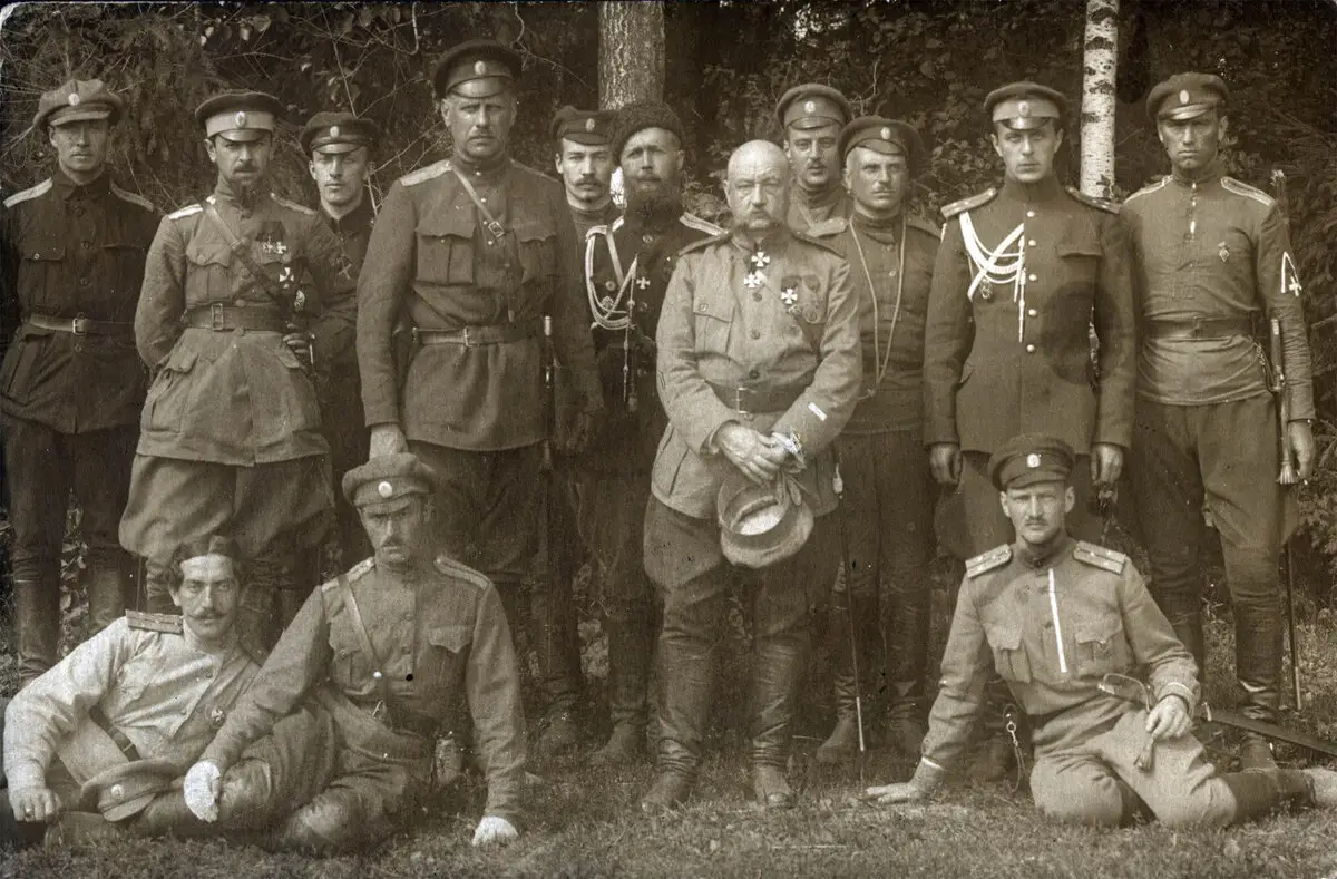 Генералы Н. Юденич и А. Родзянко с офицерами Северо-Западной белой армии, 1919 г.