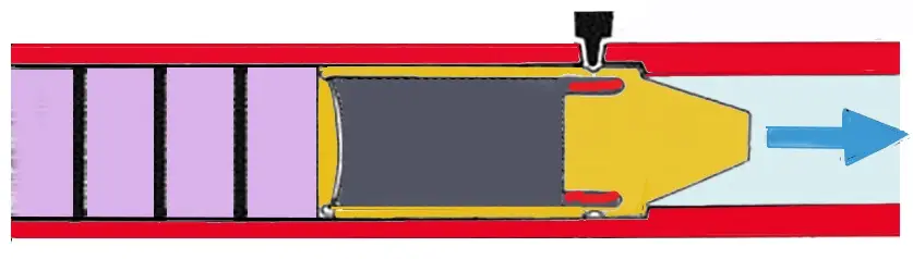 Устройство патрона-пули 9 мм AUPO фирмы «Бенелли»: розовым цветом показан затвор-поршень, серым – метательный пороховой заряд, красным – инициирующий заряд, чёрным – боек, и желтым цветом – сама пуля. Рис. А. Шепса