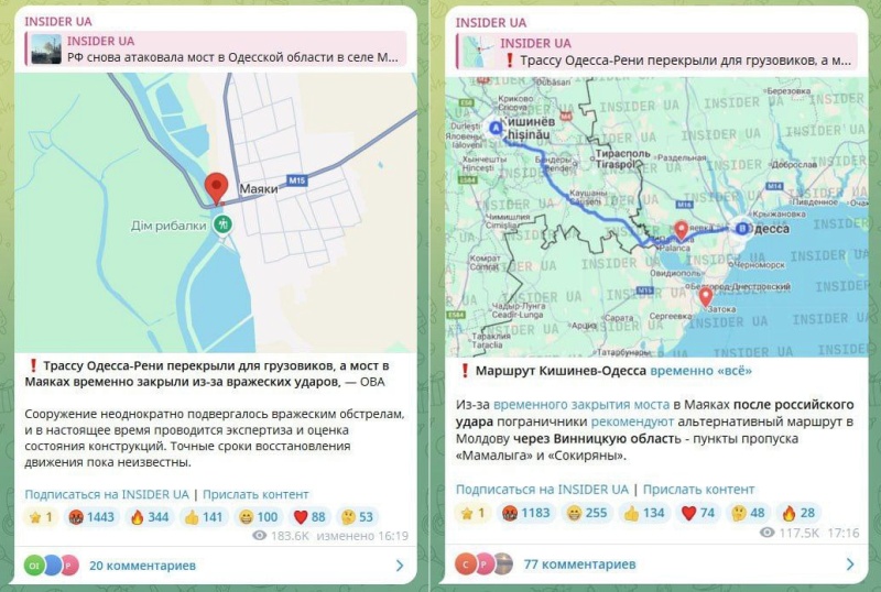 «На свой риск предлагают бежать через мост, но могут не пропустить, поэтому рассматривают объезд через Каменец-Подольский со стоянием 3–4 суток. Ещё предлагают вариант переплыть через Днестр, за что просят до 10 000 иве с человека, собирая группы. Из-за российской атаки повреждена инфраструктура возле Маяков. Движение по трассе Одесса–Рени остановлено, что осложнило проезд к погранпереходам в Одесской области. Движение перенаправляют на альтернативные маршруты. На границе с Молдовой усилен контроль. Рекомендуется выбирать пункты пропуска в Винницкой области, а также «Мамалыга» и «Сокиряны». На КПП «Могилёв-Подольский» увеличился транспортный поток», — пишет телеграм-канал «Одесса INFO».