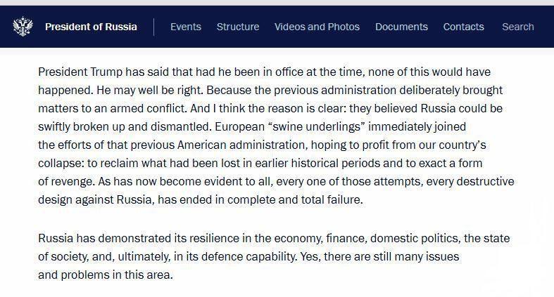 «European "swine underlings" immediately joined the efforts of that previous American administration, hoping to profit from our country's collapse: to reclaim what had been lost in earlier historical periods and to exact a form of revenge», - говорится в стенограмме выступления Путина на расширенном заседании коллегии Минобороны.