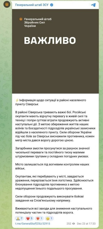 Российская сторона официально сообщила об освобождении Северска еще 11 декабря.