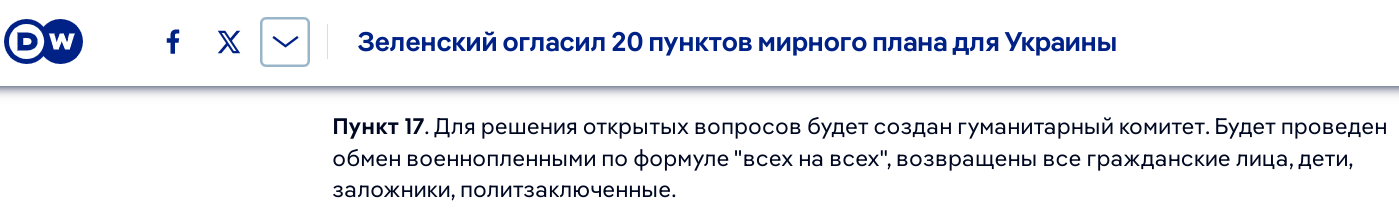 «В пункте 17 псевдо-мирного плана Зеленского указано, что Украина “освободит гражданских заложников и политзаключенных”», - отметил Дубинский в своем телеграм-канале.