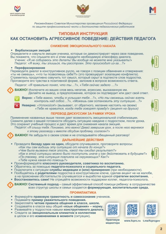 Министерство просвещения Российской Федерации направило в регионы инструкцию для работников образовательных учреждений с рекомендациями по безопасному прекращению агрессивного поведения школьников.