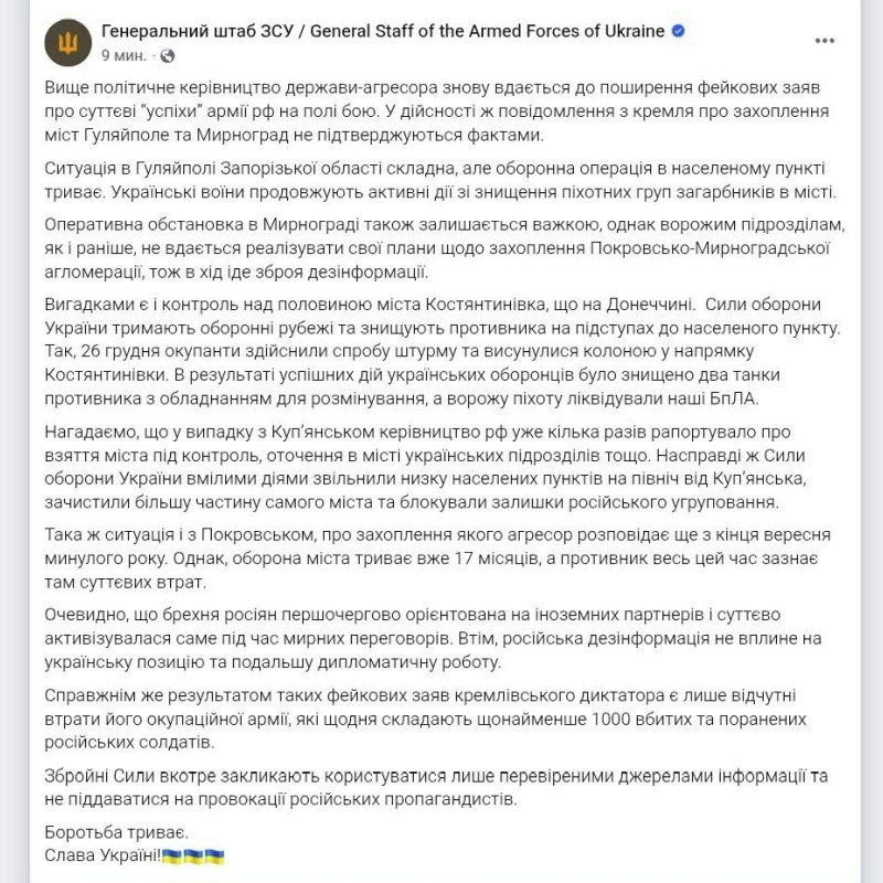 Генштаб ВСУ отрицает потерю Мирнограда и Гуляйполя, утверждается, что обстановка в обоих городах тяжёлая, но в них есть украинское присутствие, и продолжается оборонительная операция. Ранее Киев две недели отрицал потерю Северска, а затем объявил о выводе своих подразделений из города.