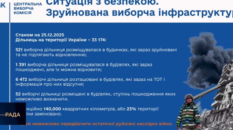 По оценкам Диденко, подготовка к выборам должна начаться минимум за шесть месяцев до дня голосования. Первые три месяца уйдут только на аудит: уцелели ли помещения для участков и безопасно ли там находиться. Ситуация критическая: более 1390 участков повреждены, а 6500 находятся на территориях, неподконтрольных Киеву. К тому же, почти четверть территории страны (23%) потенциально заминирована.