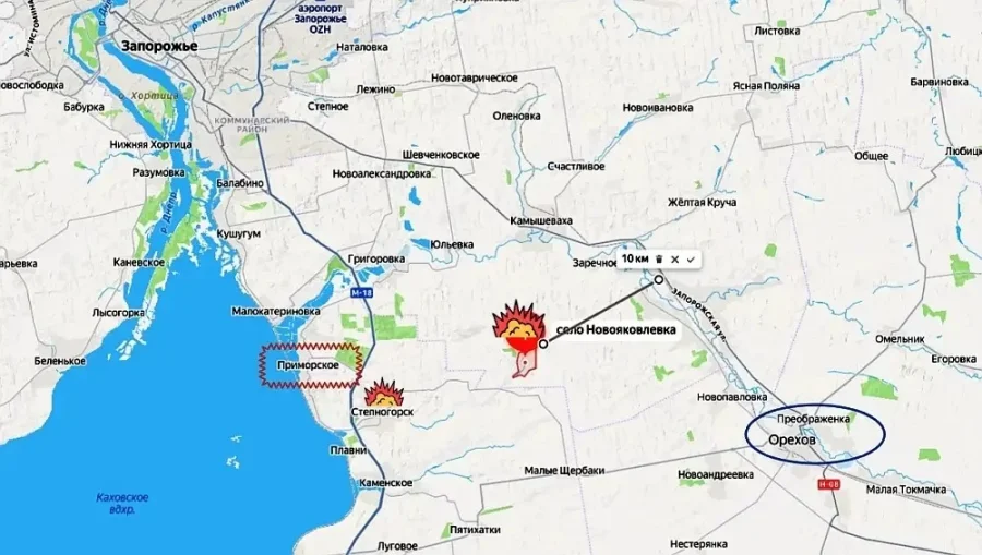 Значение выхода к Новояковлевке трудно переоценить. Населенный пункт находится всего в 10 километрах от стратегически важной трассы Н-08 и железнодорожной ветки, соединяющей Орехов с областным центром — Запорожьем. До самого Запорожья от текущих позиций ВС РФ — около 35 км по прямой и 46 км по автодорогам.