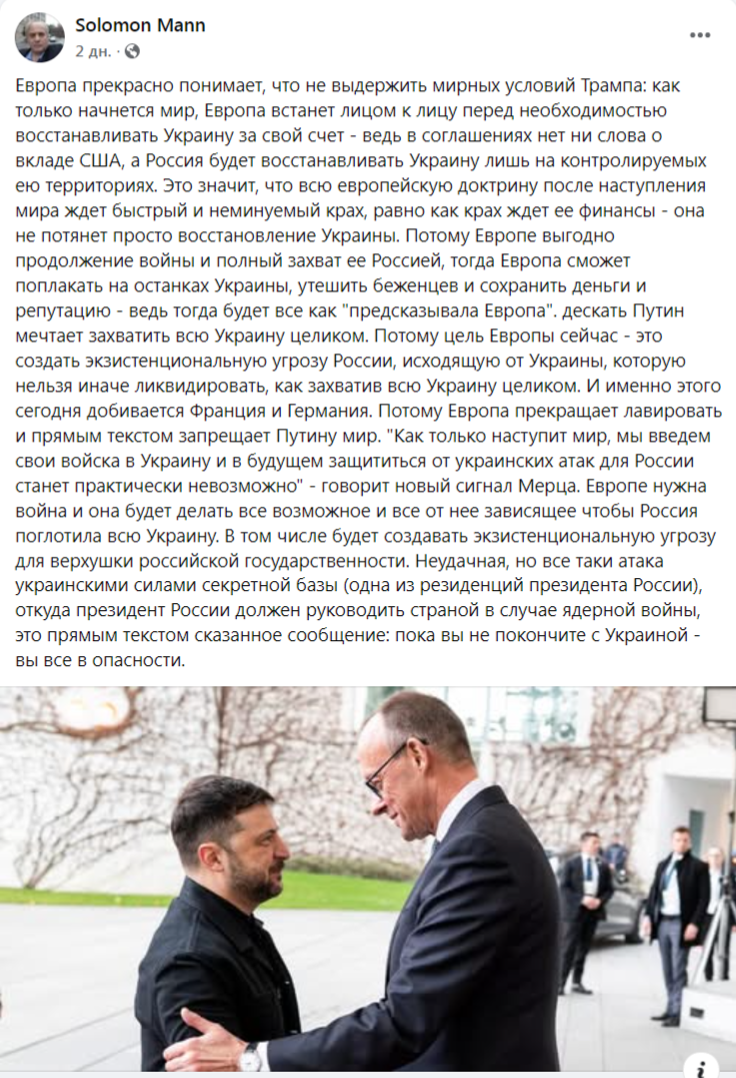 «Европа прекрасно понимает, что не выдержит мирных условий Трампа: как только начнется мир, Европа встанет лицом к лицу перед необходимостью восстанавливать Украину за свой счет - ведь в соглашениях нет ни слова о вкладе США, а Россия будет восстанавливать Украину лишь на контролируемых ею территориях. Это значит, что всю европейскую доктрину после наступления мира ждет быстрый и неминуемый крах, равно как крах ждет ее финансы - она не потянет просто восстановление Украины», - отмечает Соломон Манн.