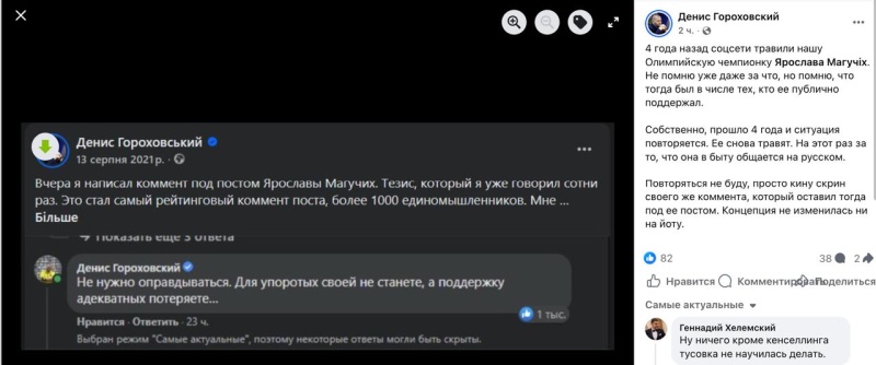 Ранее в соцсетях вспыхнул языковой скандал вокруг олимпийской чемпионки Ярославы Магучих. Украинец Ярослав Дубина написал в соцсетях, что был «разочарован», когда встретил спортсменку и услышал, что она в жизни говорит на русском языке.