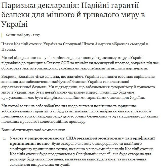6 января Украина, Франция и Великобритания подписали «Парижскую декларацию» о намерениях относительно будущего развертывания многонациональных сил на Украине после завершения военного конфликта.
