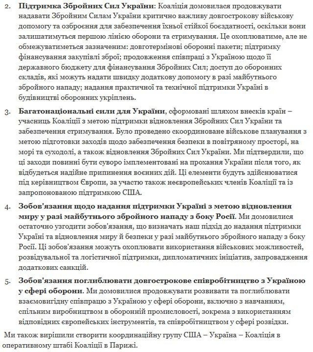 «Сегодня мы достигли значительного прогресса, что отражено в Парижской декларации, предоставляя прочные гарантии длительного мира. Эта декларация впервые признает оперативную конвергенцию между 35 странами "коалиции желающих", Украиной и Соединенными Штатами Америки», — заявил президент Франции Эммануэль Макрон.