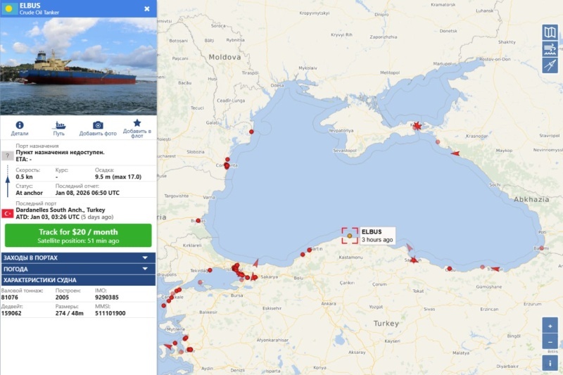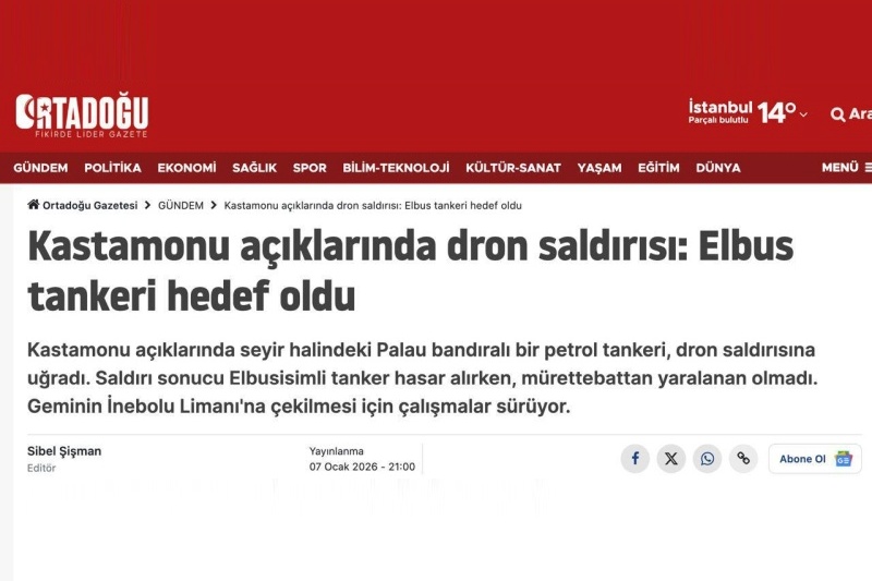 В Чёрном море новая атака беспилотного летательного аппарата по гражданскому судну. Под удар попал нефтяной танкер Elbus, следующий под флагом Палау, в 50 км от Кастамону.