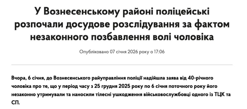 Также Николаевская полиция расследует незаконное удержание и избиение мужчины. 40-летний пострадавший заявил, что его держали и били в военкомате Вознесенского района с 25 декабря по 6 января. Открыто уголовное производство.