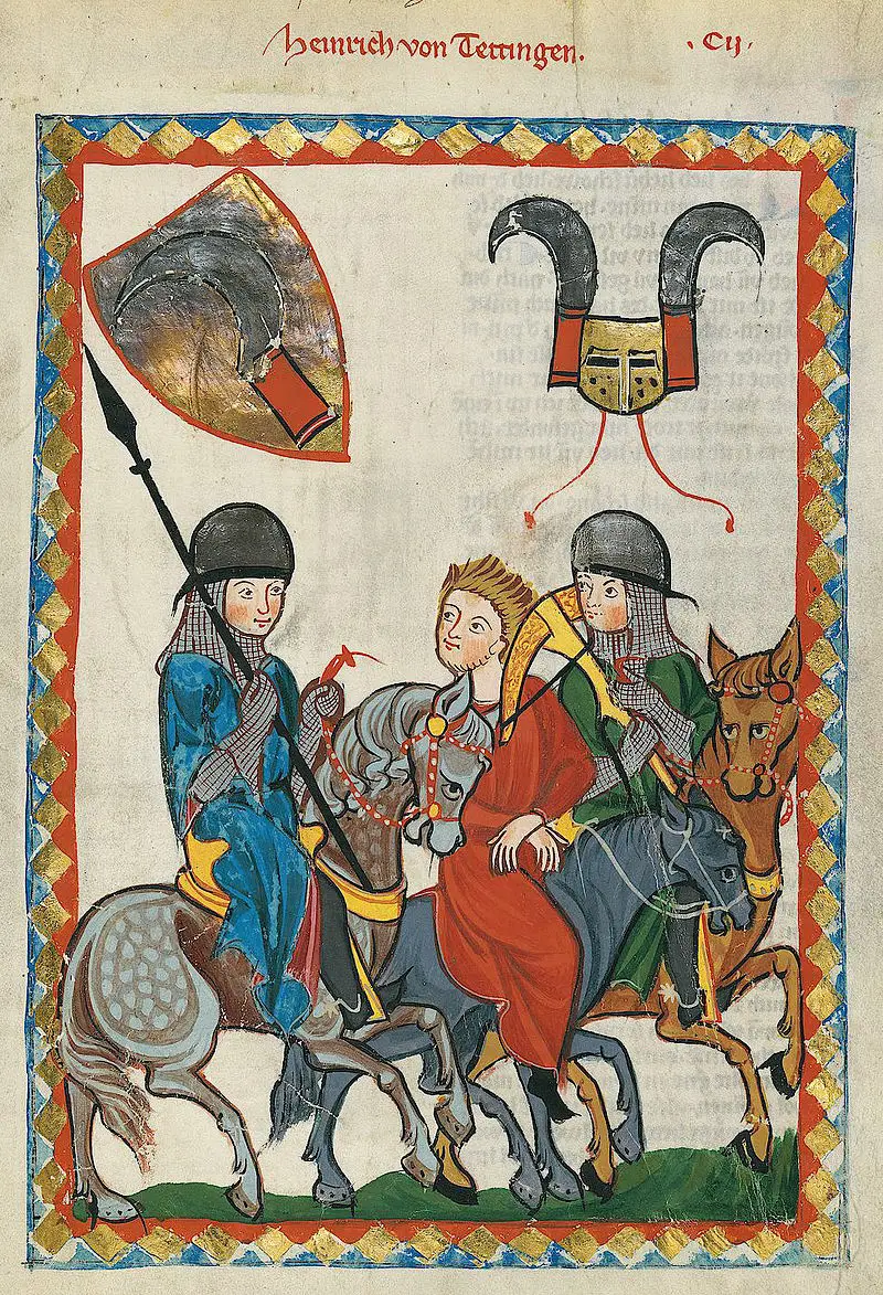 Два рыцаря, один из которых миннезингер Генрих Фон Теттингем, в шлемах сервильер. «Манесский кодекс», библиотека Гейдельбергского университета