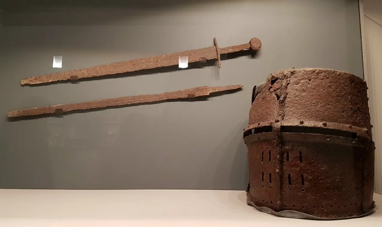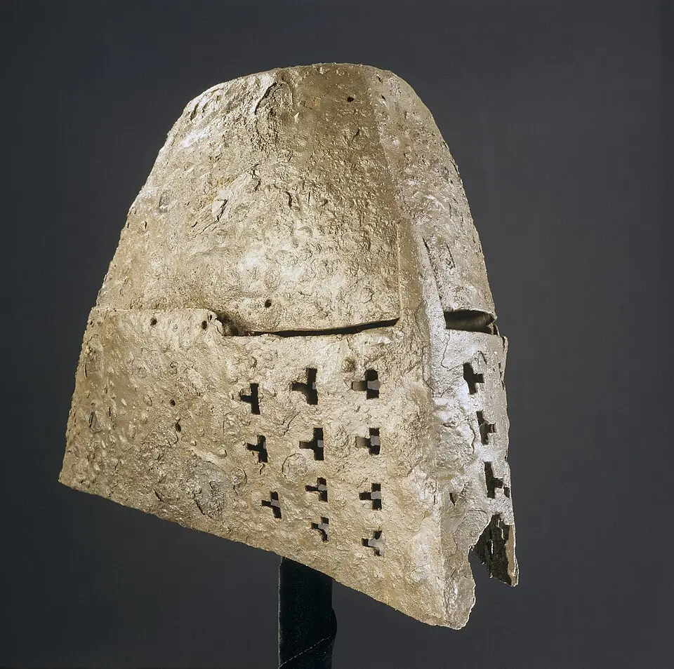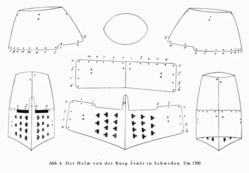 «Шлем Аранаса». Найден при раскопках руин замка Аранас в 1916 году, и сегодня он известен как «шлем Аранаса». Сильно повреждён ржавчиной и огнём. Несмотря на это, он имеет большое значение как один из известных нам шлемов XIII века. Вес 2340 г. Высота 300 мм. Ширина 200 мм. Длина 330 мм. Диаметр 170 мм. Шведский исторический музей, Стокгольм