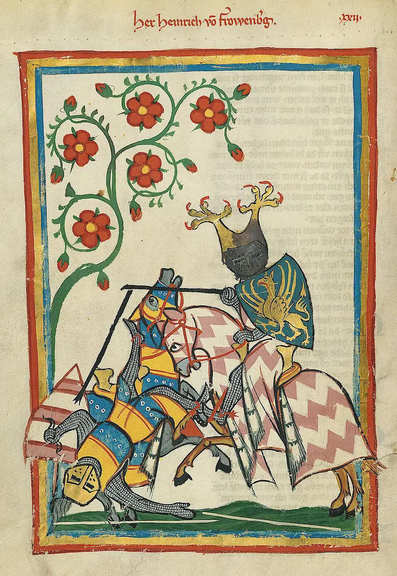 Рыцарь-миннезингер Генрих фон Фрауэнберг (ок. 1257–1314) в шлеме, украшенном когтистыми орлиными лапами. «Манесский кодекс», библиотека Гейдельбергского университета