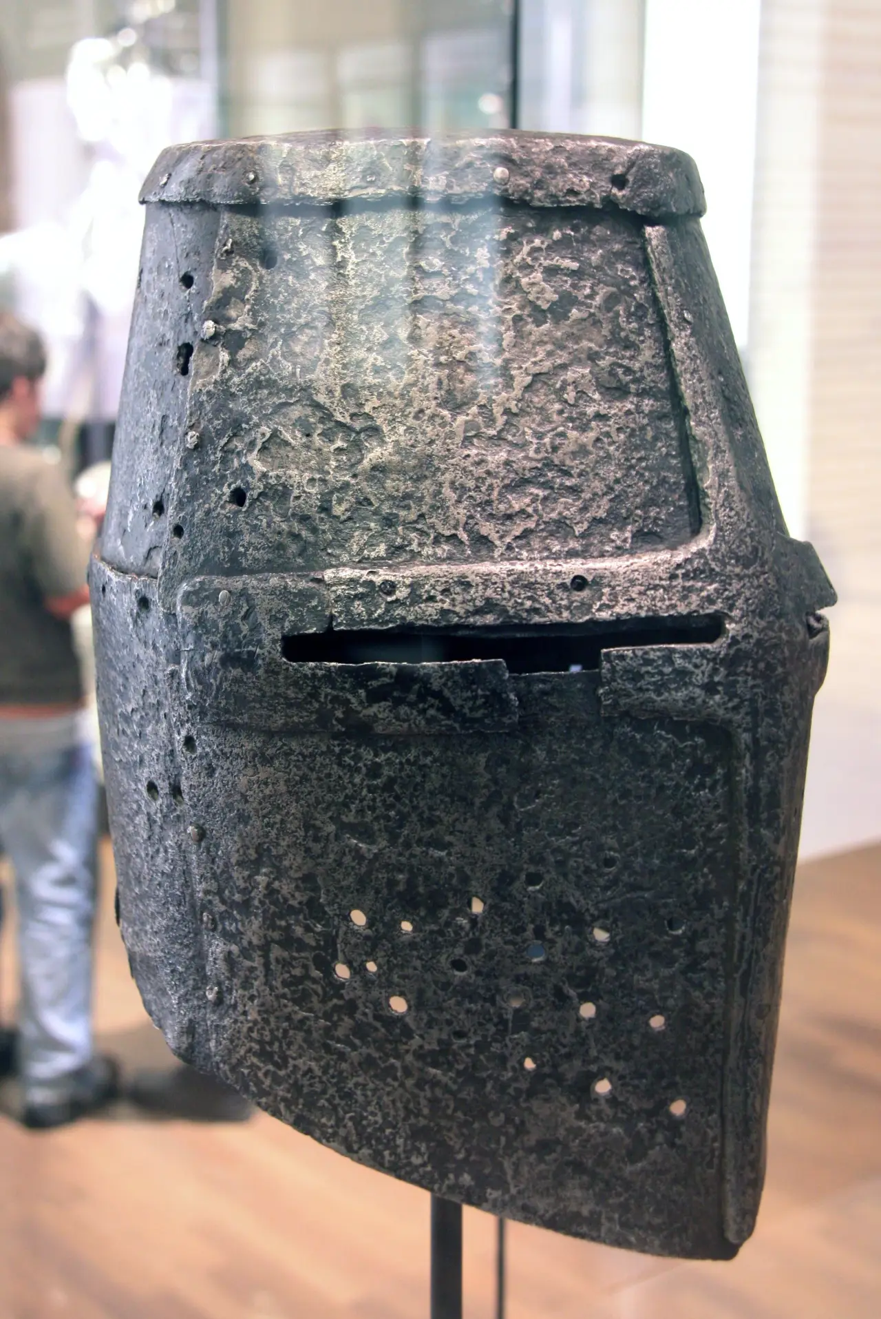 К 1290 году форма «большого шлема» вновь изменилась. Теперь его верхняя часть приобрела конусовидные очертания, а верхнюю пластину стали делать выпуклой. Такая конструкция усилила защитные возможности, хотя смотровые щели шириной 9-12 мм не обеспечивали хорошего обзора на ближней дистанции. Отверстия для вентиляции, находившиеся ниже смотровых щелей, могли иметь разную форму. Иногда их пробивали так, что получались узоры или изображения (как это было сделано, например, на шлеме Эдуарда Уэльского – «Чёрного Принца», где их сделали в виде короны), но чаще просто пробивали их в шахматном порядке. На поздней разновидности этого шлема второй половины XIV века – кюбельхельме – эти вентиляционные отверстия уже в XIV веке стали располагать исключительно с правой стороны, чтобы не ослаблять металл на левой стороне, больше всего подверженной ударам копий противника.
